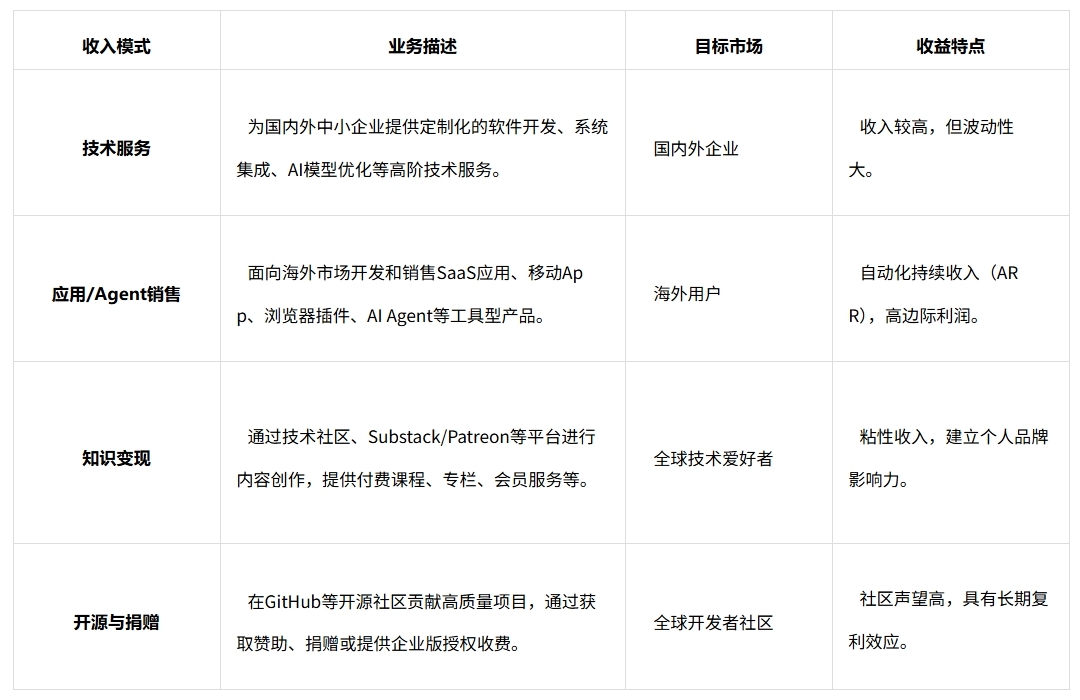 独立开发者A曾表示,“过去我在大厂负责复杂的系统架构,虽然收入稳定,但个人价值的体现却受限于组织目标。” 在转型成为一名独立开发者后,他的收入核心在于将“技术”转化为“产品”和“服务”。