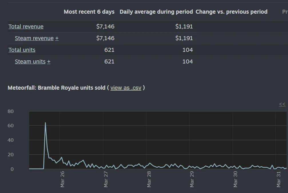 无独有偶,《Meteorfall》系列作者 Eric Farraro 满怀信心地在在 Steam 上推出新作 《Bramble Royale》,却遭遇了惨淡的销量。花了 4 年时间、投入 6 万美元(约人民币 43.8万元)开发的游戏,最终惨遭滑铁卢第一周仅售出 621 份,总收入只有 7100 美元。