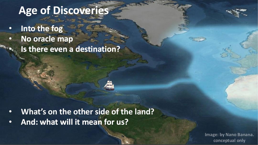 演讲最后,他用一张 Nano-Banana 生成的非常有寓意的图作为结尾:一艘船驶向迷雾中的大海。