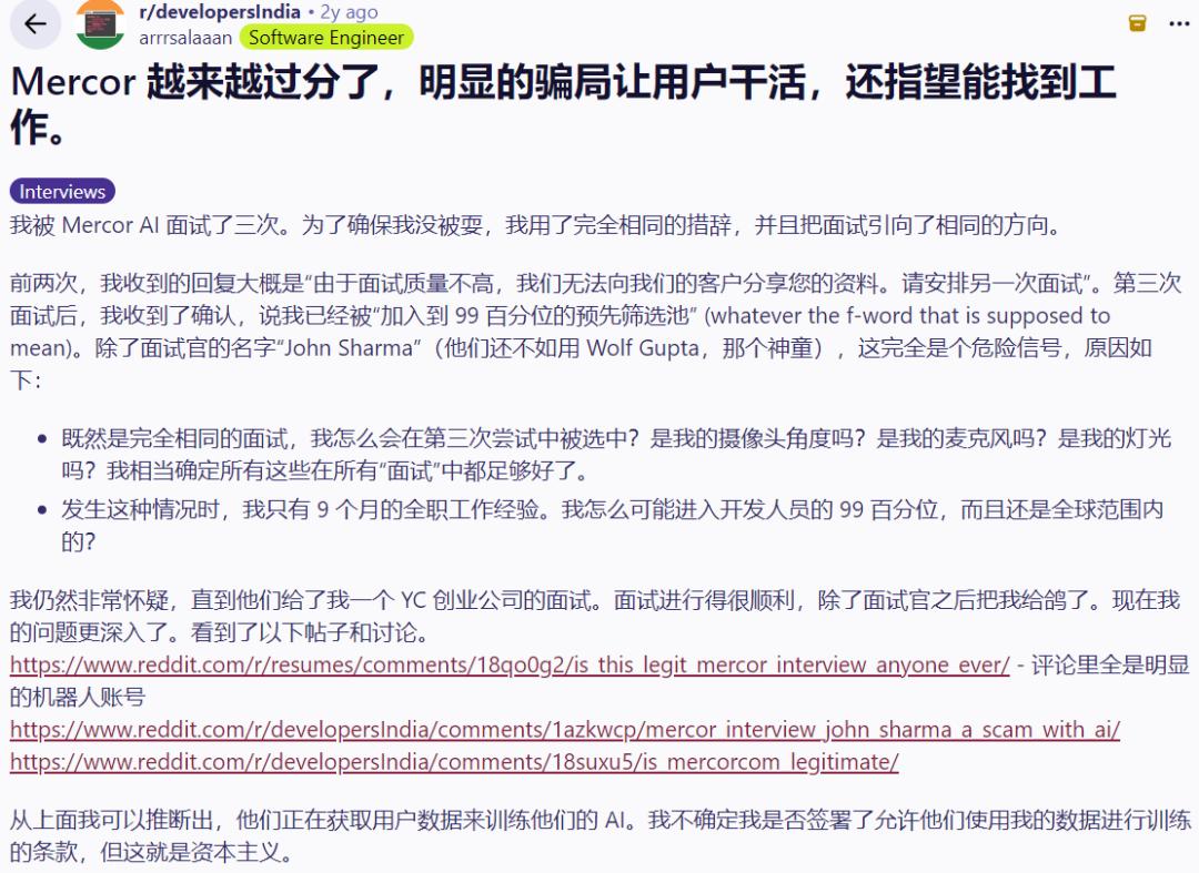 有人被面试官疯狂放鸽子;有人收到了Offer,结果发现发件人的领英是假的,查无此人;甚至有个老哥,才工作了9个月,愣是被Mercor评定为“全球顶尖人才”,进入了所谓的“前1%人才池”。