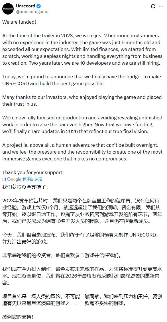 而Drama Studios在X也发布了相关消息表示,终于有了足够的预算来制作 UNRECORD,将在2026年给出最新版本的消息。