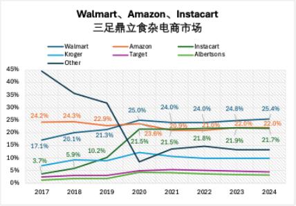 但在生鲜食杂(Online Grocery)这个细分领域,局势却发生了逆转:依靠强大的线下履约能力,沃尔玛以25%的份额反超了亚马逊的22%。