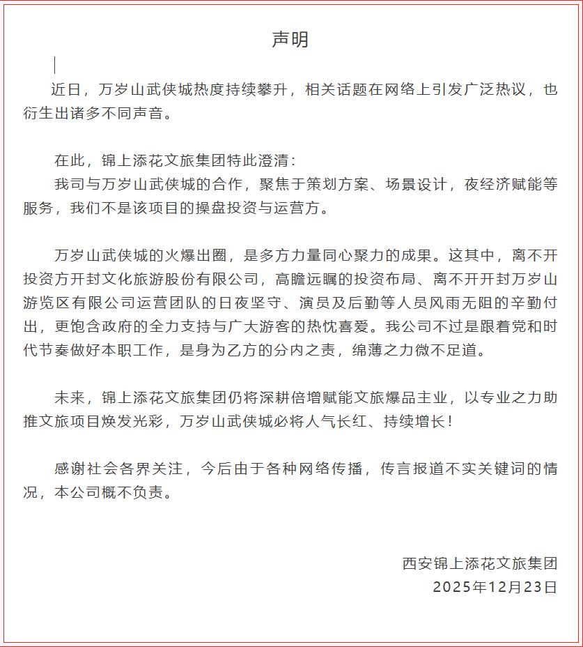 最近,开封万岁山武侠城一则报喜的《万岁山武侠城及合作景区经营数据2025年报》,因为文末声明把西安锦上添花文旅集团架在了火上烤。
