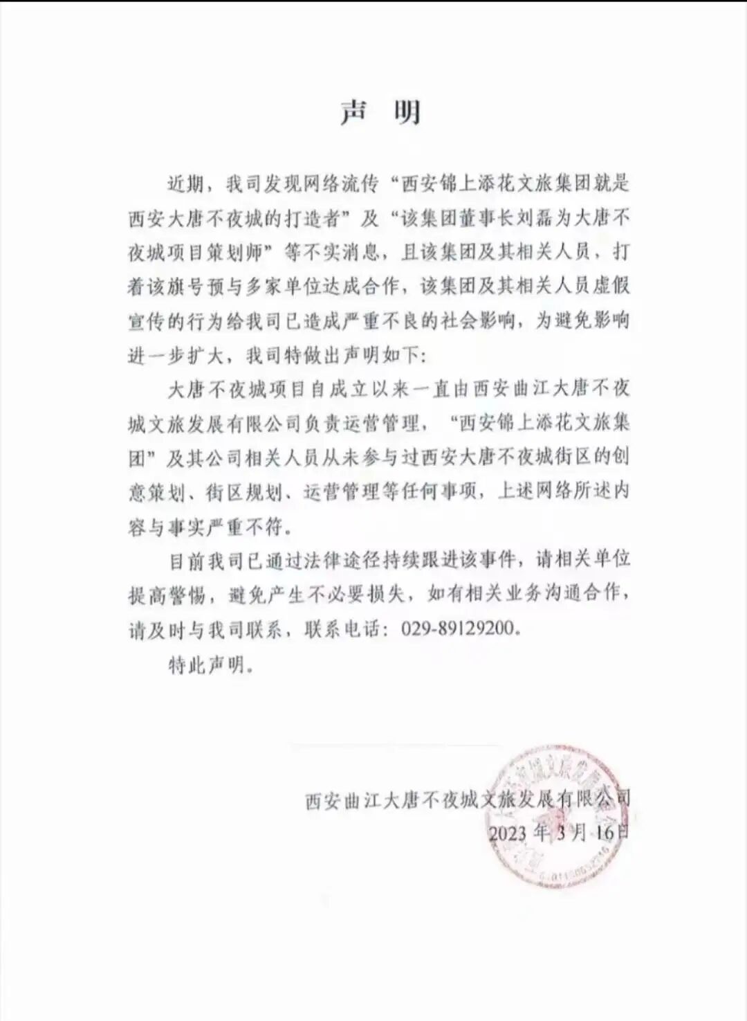 这也让人不禁想起了当年的曲江文旅。 历史总是惊人的相似,早在大唐不夜城爆火之时,锦上添花也曾因为类似的宣传口径,引来了曲江文旅的公开打假。 彼时的剧情与今日如出一辙,一方高调揽功,一方严正声明。