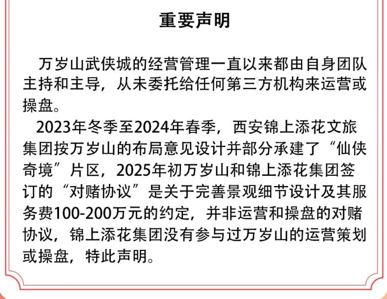 声明中,对于外界一直盛传锦上添花是万岁山武侠城百亿流量操盘手,景区方面明确表示,从未委托给任何第三方机构来运营或操盘,尤其那份传得神乎其神的对赌协议,被景区定性为“关于完善景观细节设计及其服务费100-200万元的约定”。