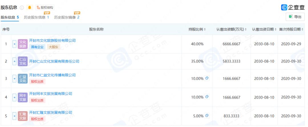 企查查显示,2020年9月,疫情初始阶段,全国景区陷入运营困难时,开封市国资委全资控股的开封市文化旅游股份有限公司在万岁山游览区有限公司首度持股,目前持股40%,为万岁山景区第一大股东。