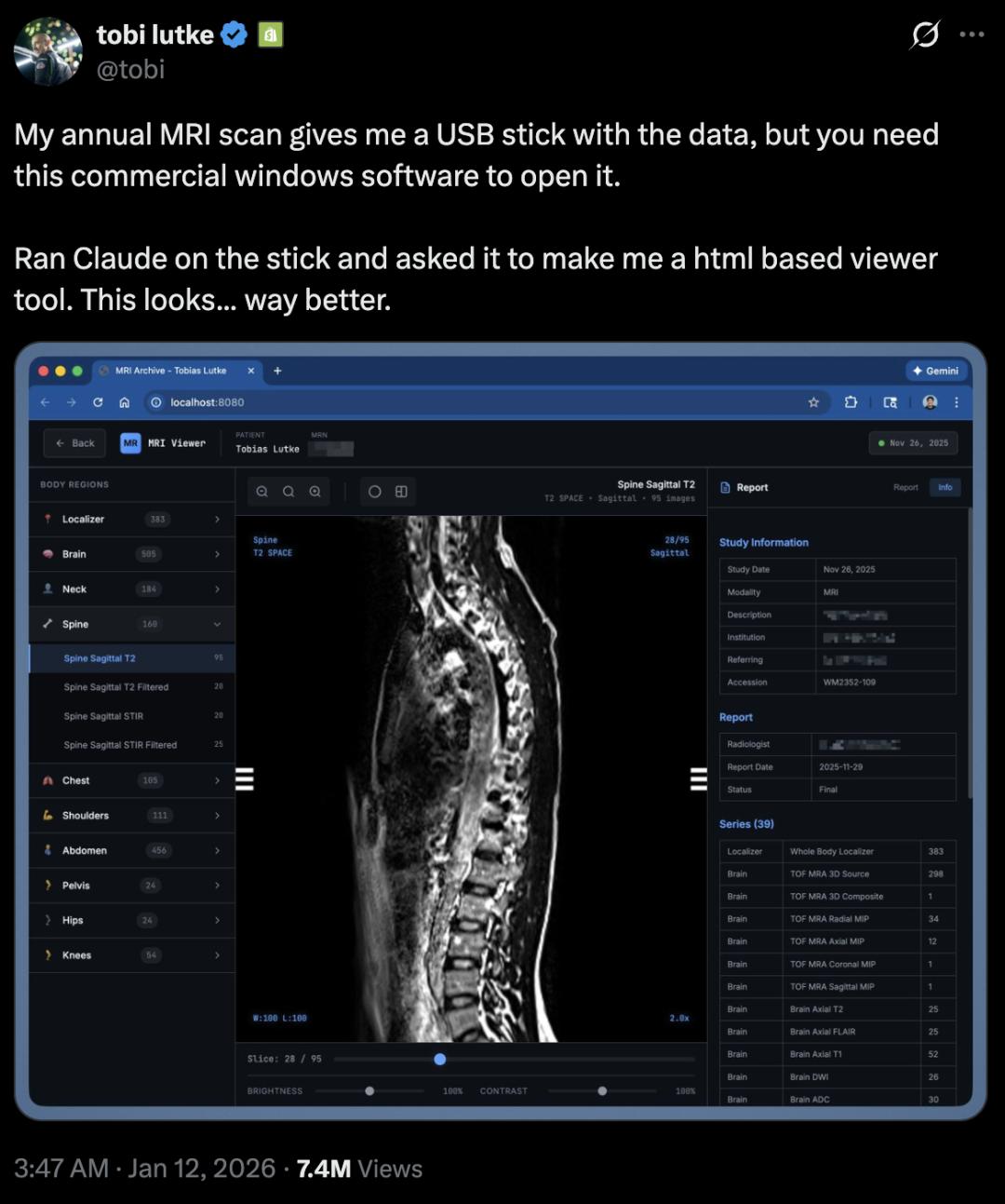 在社交平台X上,Shopify的首席执行官Tobi Lütke透露,他曾用它编写软件来分析自己最近收到的核磁共振成像结果。
