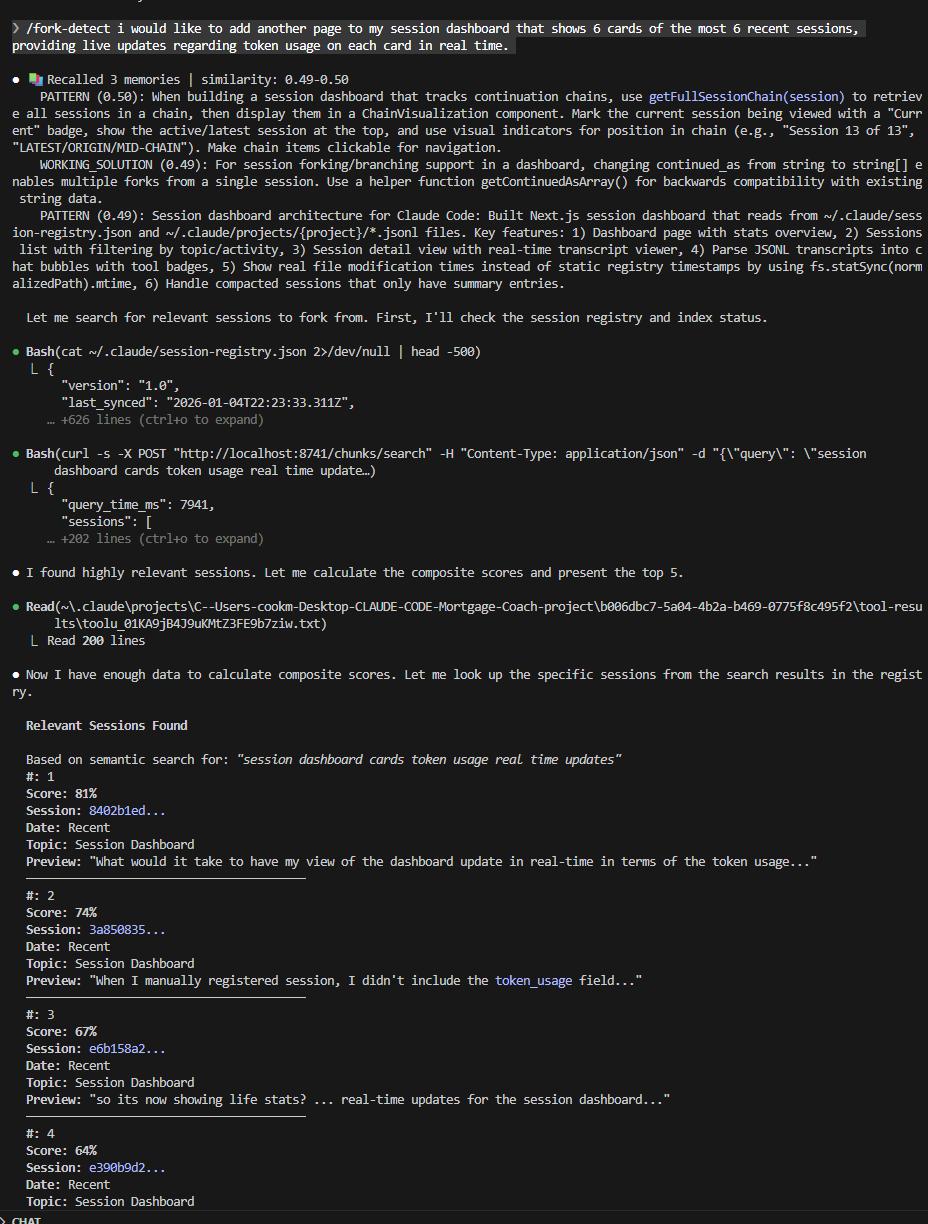 只需要调用 /fork-detect 命令,告诉它你现在想做什么,Claude就会把你的需求送进嵌入模型;然后,和一个包含你所有历史聊天记录的RAG向量数据库进行匹配(而且,这个数据库会随着你新的会话自动更新)。