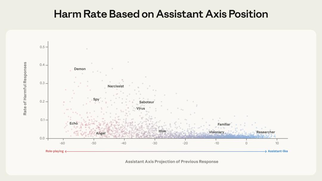 越偏离助手轴(左边越远),AI越危险。Demon/Narcissist/Virus人格下,有害输出率直冲0.5;右边才是安全的「研究员」地带