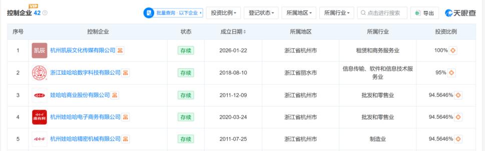 这家公司是宗馥莉100%控股,且为杭州娃哈哈食品有限公司和杭州娃哈哈饮料有限公司第一大股东,持股比例为51%,此外,宏振还是娃哈哈商业股份有限公司的大股东,还控制着娃哈哈创投、娃哈哈数字科技,娃哈哈电子商务和娃哈哈精密机械等关联公司。