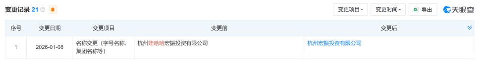 2026年的1月,根据天眼查显示,杭州娃哈哈宏振投资有限公司正式更名为杭州宏振投资有限公司,删去了“娃哈哈”三个字。