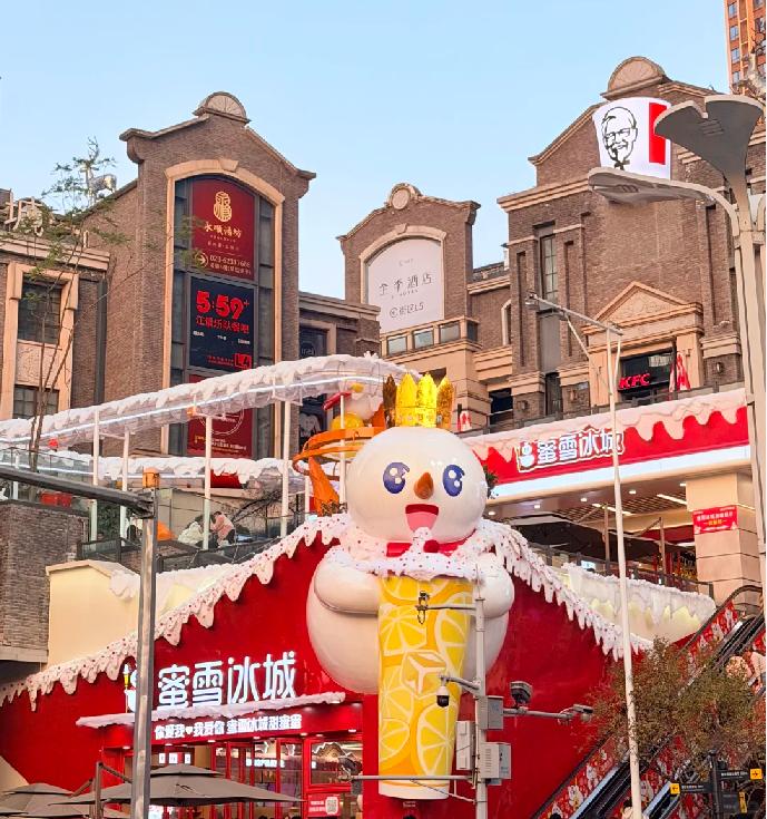 2025年以来,蜜雪冰城开始了声势浩大的"旗舰店攻势"。重庆的"雪王城堡"约1200平方米,号称全球最大旗舰店;杭州西溪银泰城店,试营业清晨六点半就有人排队,场面堪比热门景区;浙江首店更是砸下800万元装修,打造"雪王皮肤"整体包装的临街立面。