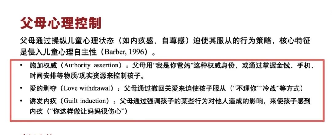 所谓心理控制,主要表现为:爱的撤回(你再玩手机,我就不喜欢你了)、诱发内疚(我为你付出这么多,你就这样报答我?)、施加权威(不许玩手机)等等。
