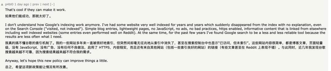 不过我现在已经越来越搞不懂 Google 的索引机制了。有些网站多年来一直被收录得很好,但突然之间就从索引里消失了,而且没有任何解释,甚至在 Search Console 里也只显示“已访问,未编入索引”。这些页面只是很普通的博客内容,结构简单、没有 JavaScript、没有广告,也没有任何“违规操作”,使用 HTTPS,而且内容本身还被其他网站引用,其中一些甚至在 Reddit 上表现不错。