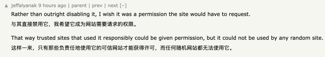 有网友认为,「与其直接禁用这种功能,更希望它变成一种“权限机制”,由网站主动申请才能使用。这样一来,那些值得信任、并且使用方式合理的网站可以获得授权,而普通的、来路不明的网站则无法随意使用它。“