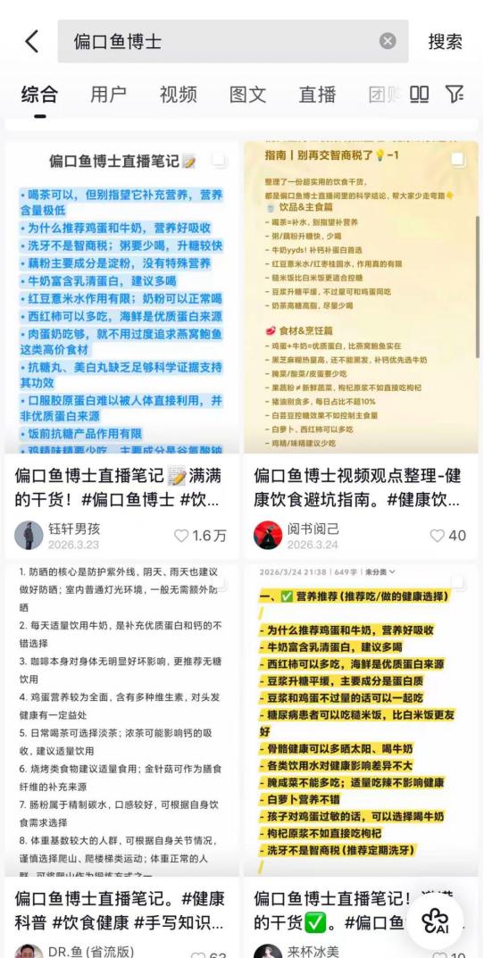 某种程度上,这也解释了偏口鱼博士的走红。在社交平台上,他的直播切片被大量传播,粉丝把他的科普金句整理成笔记,反复转发分享。这些“收藏”“转发”“搜索”行为,都在向算法释放一个信号:这是一个值得继续推荐的人。