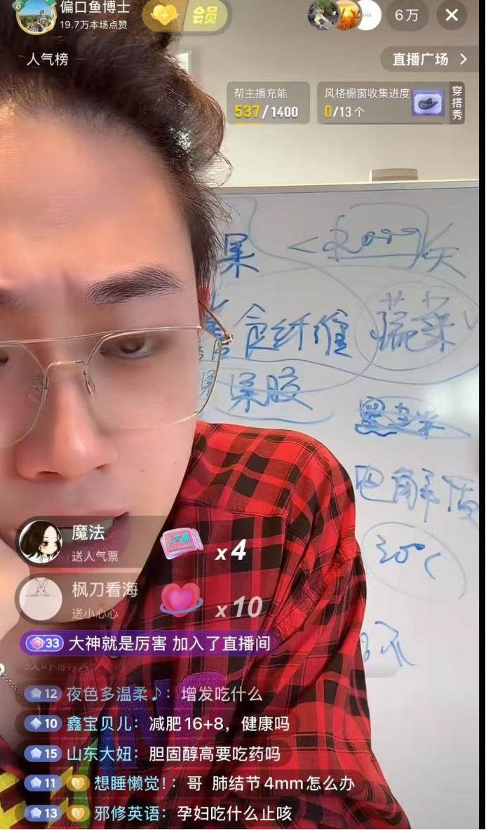 但整体看下来,偏口鱼博士并没有多到足以完全解释其爆红的特殊性。抖音并不缺用段子拆解医学干货的科普主播,他也不像董宇辉那样,开创了一种高度鲜明的知识带货风格。因此,仅靠个人风格,很难解释他为什么能迅速成为一个拥有百万场观的网红。