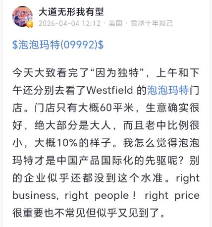 他在社交平台上分析,目前泡泡玛特的壁垒有用户关注度、艺术家的签约、全球各地的门店以及王宁团队。这些壁垒远比想象中强大,只要潮玩会有持续性,泡泡玛特就是非常好的生意了。