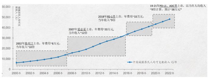 我们知道,药品研发需要很多投入。给各位看一个数字,我们发现,这些新的抗癌药品的定价基本上是以年度的可支配所得的8-10倍来定的。