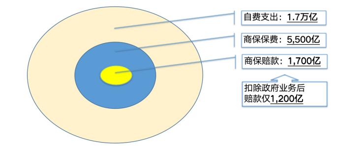 2018年我们在商业健康险上花费五千五百亿,保费是交给保险公司的,其实老百姓拿不到,真正成为赔款的部分只有1700亿,1700亿里面还有500亿是政府合作业务(大病保险),跟一般这种赔付的性质不一样。所以扣掉这个政府合作业务,只有1200亿是用于支付患者自费的赔付,7%这个数字可以小到忽略不计。