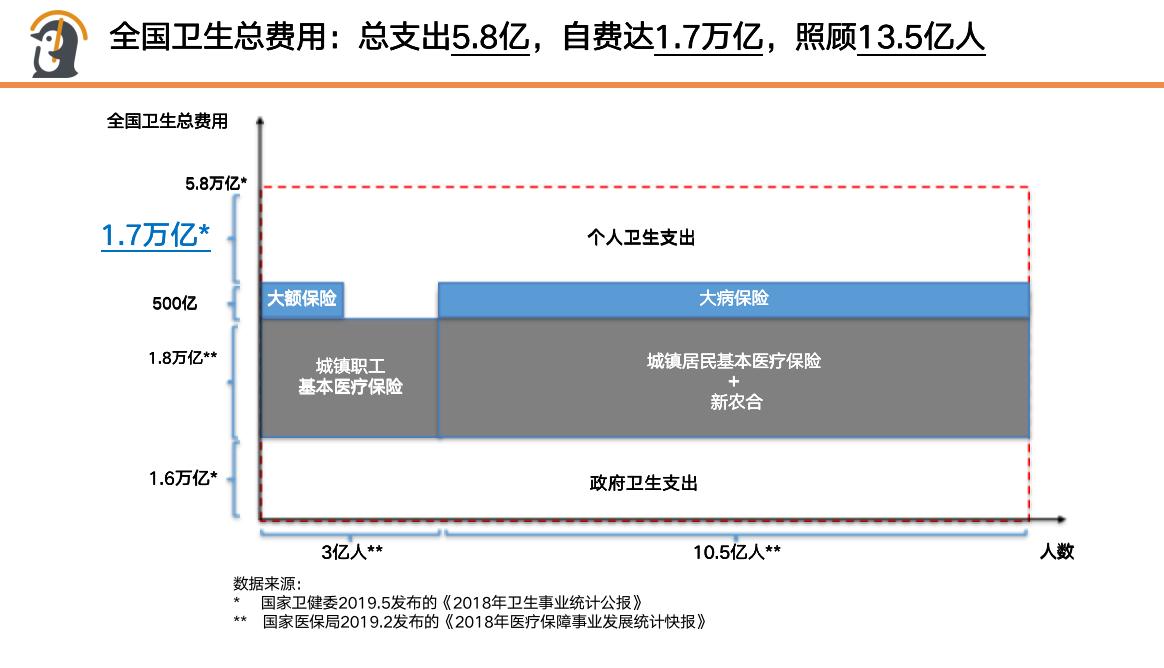 首先我们先把这个潘朵拉的盒子打开,这个是2018年的数字,2019年的数字会更大。根据国家卫健委和国家医保局发布的数据,2018年的时候,整个国家我们花了5.8万亿在全国卫生的总费用,下面的1.6万亿由国家来买单,覆盖医院建设、医护人员的工资等等。中间这一块是给不同的人群,像城镇职工、居民等等医保的支付,这里花了大概1.8万亿,可是总共是5.8万亿,所以5.8万亿扣掉了1.6万亿政府买单,扣掉了1.8万亿医保买单,剩下的部分就是自费,可以视为是老百姓的压力,所以这个部分可以用保险来补偿。