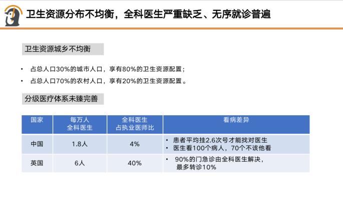 回到数字。目前30%的城市人口消耗80%的医疗资源,而70%的城镇人口只享有20%医疗资源,这个分配是不均的。在实际导流分配时,却没或很少有类似国外全科医的角色来导诊。所以从病人的角度来看,“我可能挂了三次号才找对了医生。”