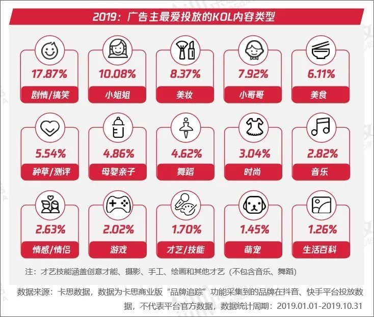 ▲2019年1-10月广告主最爱投放的KOL内容类型(数据来源:卡思数据)