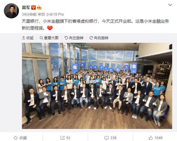雷军在微博中表示,“这是小米金融业务新的里程碑”。天星银行这也是众安银行之后的第二家香港虚拟银行。