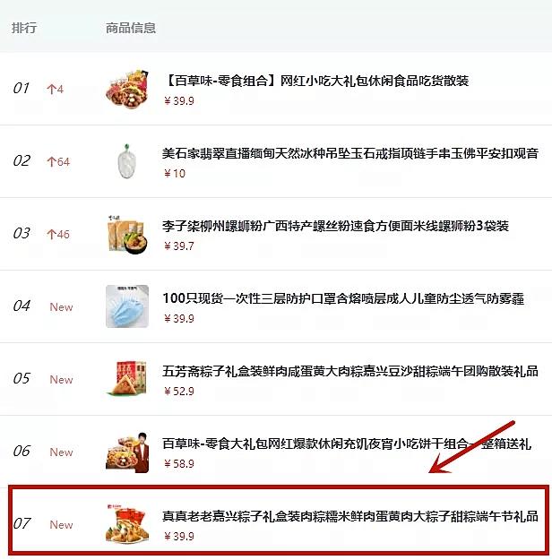 (知瓜数据5月爆款商品榜,真真老老粽子礼盒排名第7|图源:知瓜数据)