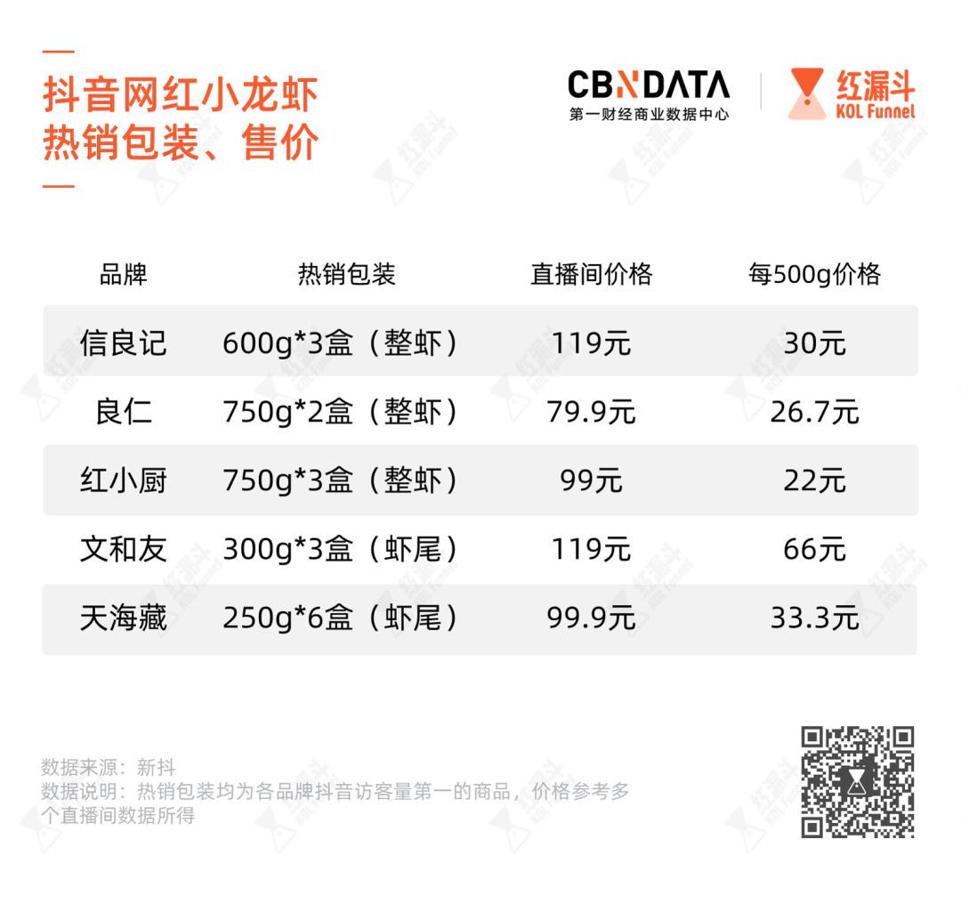 信良记、红小厨、良仁的热销商品都是整虾,最便宜的红小厨1斤22元,最贵的信良记1斤30元。食用方便的虾尾差价更大,文和友1斤虾尾要价66元,天海藏却低至1斤33元,仅比信良记整虾高3元。