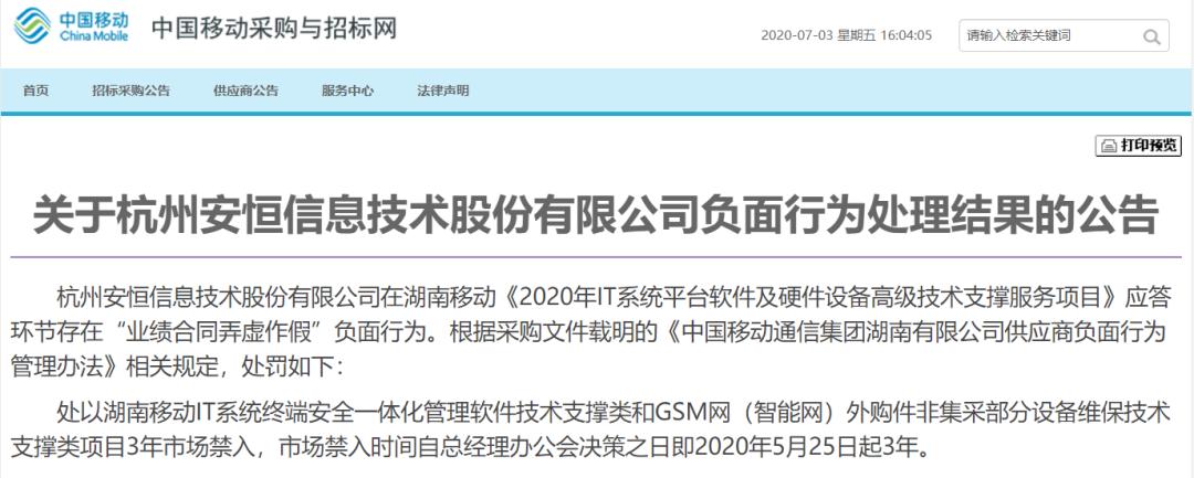 比如在“二采供应商负面行为公告”中,目前股价313.45元/股,市值232亿元的科创板上市公司安恒信息,就曾因在湖南移动的采购项目中存在“业绩合同弄虚作假”的负面行为,被处以湖南移动IT系统终端安全一体化管理软件技术支撑类和GSM网(智能网)外购件非集采部分设备维保技术支撑类项目3年市场禁入。市场禁入时间为自2020年5月25日起的3年。