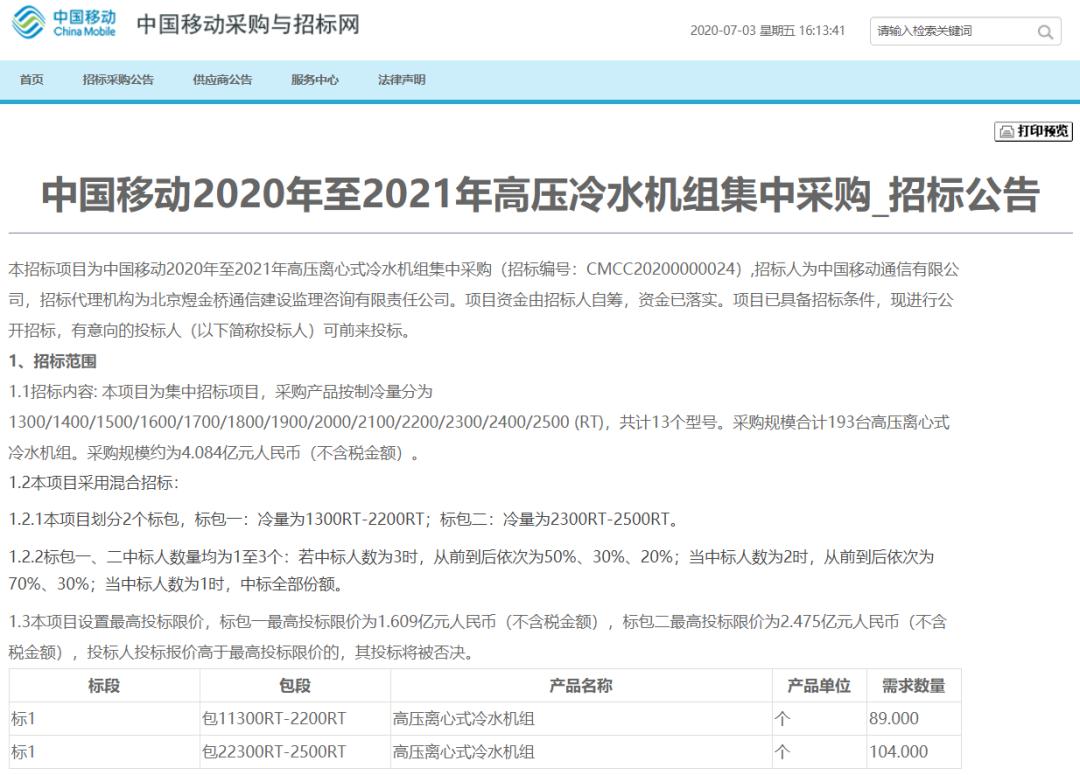 每经小编(微信号:nbdnews)注意到,此次项目为中国移动2020年至2021年高压离心式冷水机组集中采购项目。2020年2月,项目招标公告发布,其中显示此次采购规模合计193台高压冷水机组,采购规模约为4.084亿元(不含税金额),采用混合招标,划分为2个标包,当中标人数为2时,从前到后中标份额依次为70%、30%,当中标人数为1时,中标全部份额,标包1的最高投标限价为1.609亿元(不含税金额),标包2的最高投标限价为2.475亿元(不含税金额)。