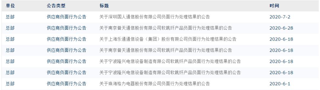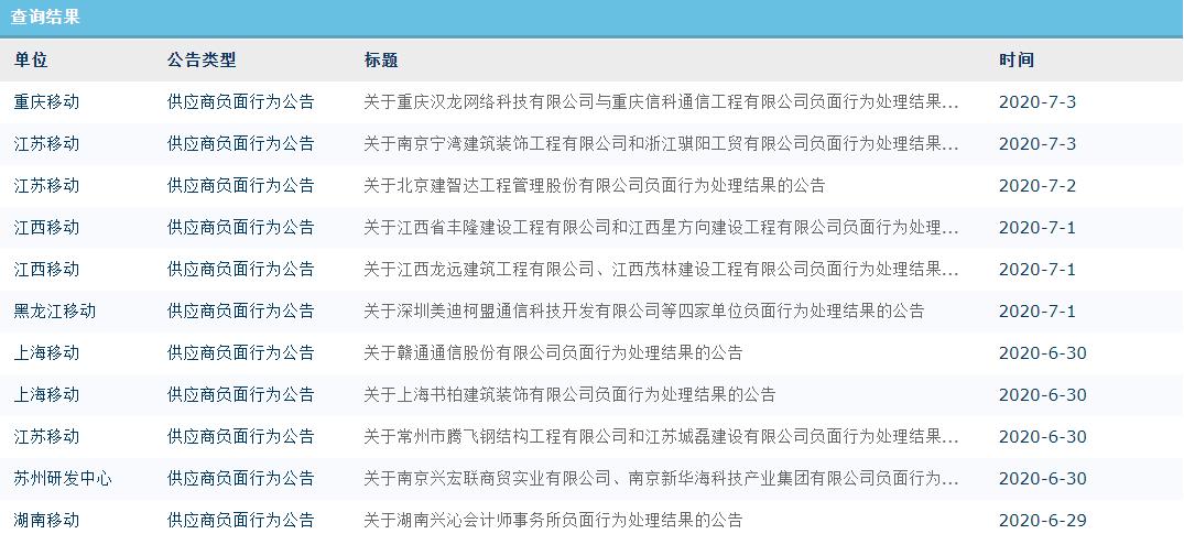 二采供应商负面行为公告,涉及的是各省级移动公司、研发中心、设计院等招投标采购项目。截至7月3日下午,今年以来共计发布351份。