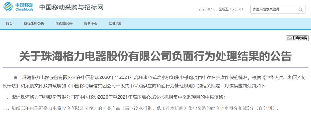 鉴于珠海格力电器股份有限公司在中国移动2020年至2021年高压离心式冷水机组集中采购项目中存在弄虚作假的情况,根据《中华人民共和国招标投标法》和采购文件及其载明的《中国移动通信集团一级集中采购商负面行为处理规则》的相关规定,对该供应商处罚如下: