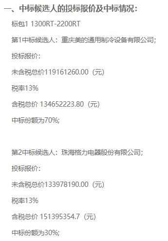 2020年3月,采购中标候选人公示,2个标包的中标候选人为重庆美的通用制冷设备有限公司(简称“重庆美的”)与格力电器。公示显示,此次集中采购中重庆美的投标报价较低,标包1、2的不含税报价分别为11916.12万元、16509.17万元;格力电器的投标报价较高,分别为13397.82万元、18799.05万元。最终两个标包重庆美的均中70%的份额,格力电器均中30%的份额。