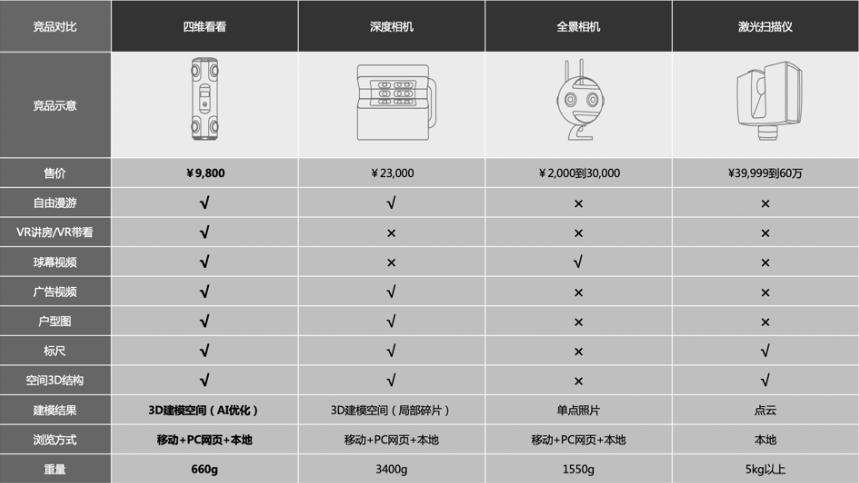 不同于传统的线上填表、上门拍摄的服务流程,使用者可以直接购买和使用四维看看在空间内进行简单拍照并上传数据,即可生成高清三维立体模型,不再需要专业人员的操作,使整个的操作流程可以从3小时缩短至10分钟。660g的硬件重量较同类产品的1kg以上重量有很大优势,方便使用者携带和操作。