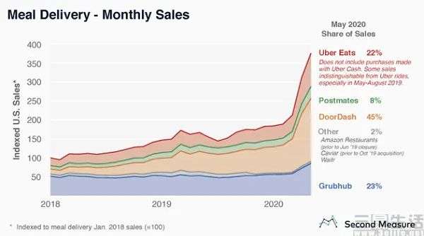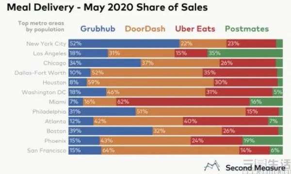 在经过了从2018年开始的美国外卖市场洗牌,到Uber收购Postmates的这段时间里,亚马逊于去年6月关闭了自家的外卖业务Amazon Restaurants,Caviar以4.1亿美元的价格在去年年初卖身DoorDash,美国外卖市场上所呈现出的是四分天下的局面,Postmates、Grubhub、Uber Eats和DoorDash分别以8%、23%、22%,以及45%的市场份额,以及几乎完全瓜分了整个美国的外卖市场。
