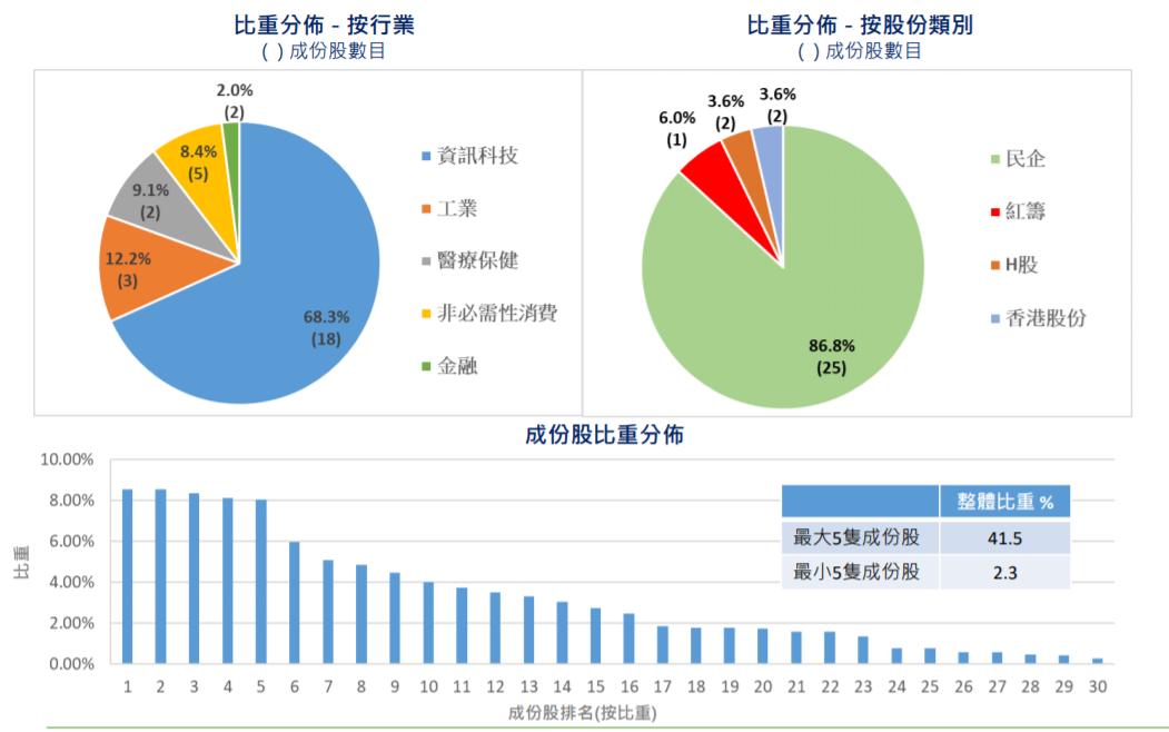 此外,如果IPO股票在第一个交易日收盘时的市值位列现有成分股前10名,该股将被纳入该指数,通常在新发行的第10个交易日结束后实施添加。从目前的成分股比重分部来看,资讯科技占比最大,达到68.3%。其次为工业,占比12.2%。