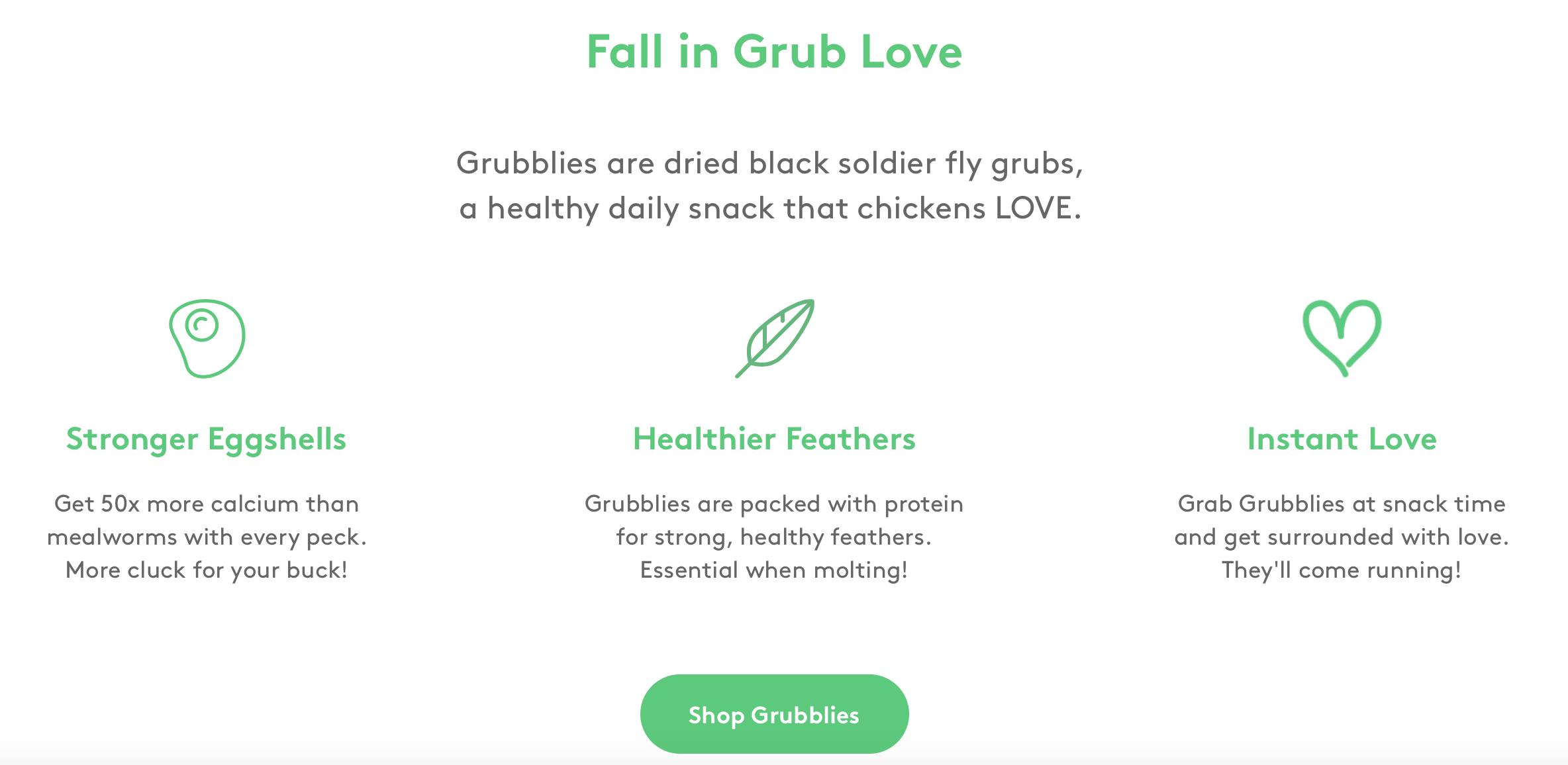 2016 年,首席执行官 Sean Warner 和首席运营官 Patrick Pittaluga 创办了 「Grubbly Farms」,它是一家以昆虫为基础的鸡饲料提供商,提供了“Grubblies”和“Grubbly Layer Feed”两种营养的、有利于可持续的产品,这些饲料由苍蝇幼虫(grubs)制成,它是一种可持续的蛋白质来源,也是鸡非常喜欢的食物。