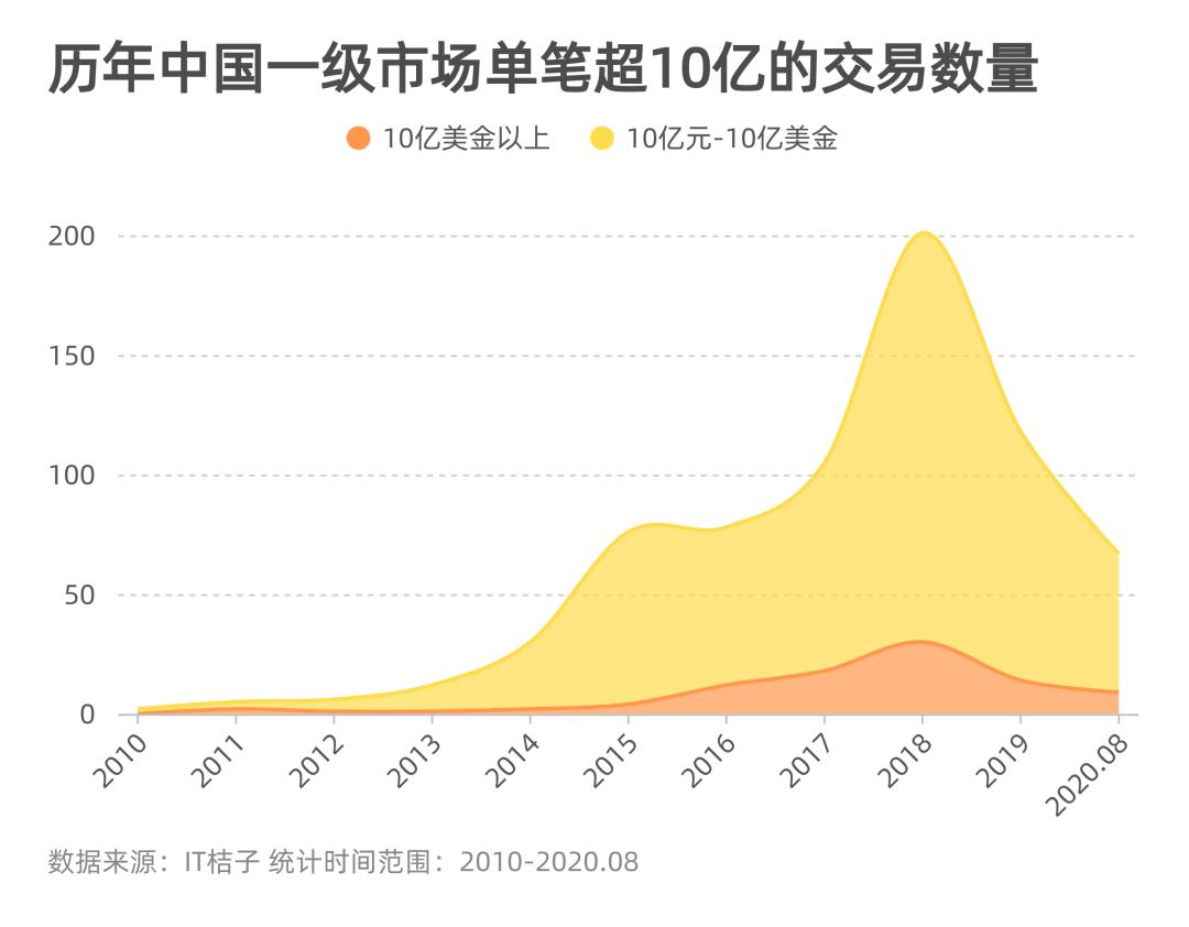 2014 年及之前,一级市场单笔投资额在 10 亿元-10 亿美金的每年都不会超过 30 起。10 亿美金的更是鲜有。