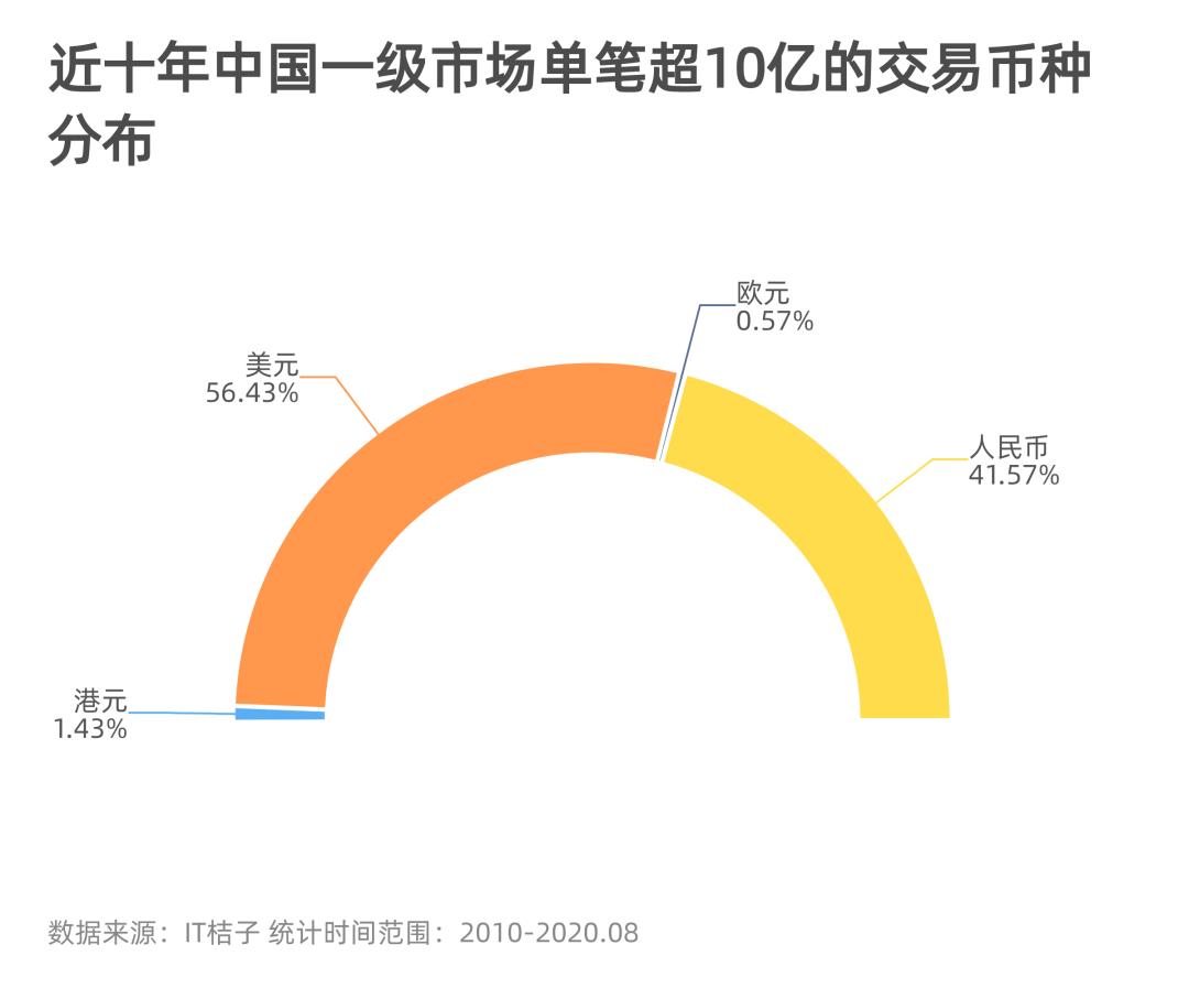 从币种分布来看,超 10 亿元的大案子中,美元和人民币交易各战半壁江山,占比分别达到 56.4% 和 41.6%,美元交易略多一些。根据观察,生物制药与技术企业、新车制造、无人驾驶类企业更多选择了美元交易——这与其前期投入极大、需要资本更多耐心或者考虑境外上市成功可能性更高有一定关系。