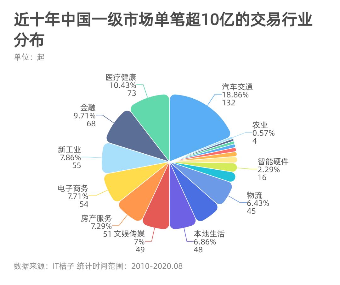汽车交通领域占据了市场上 18.9% 的超 10 亿元交易——无论是做新能源造车、还是无人驾驶技术研发,这些赛道都是需要持续、大量资金投入的高科技领域;而像二手车交易、网约车、共享单车等几个凭烧钱抢市场的赛道,会产生一些主动、或者被动的大额交易。