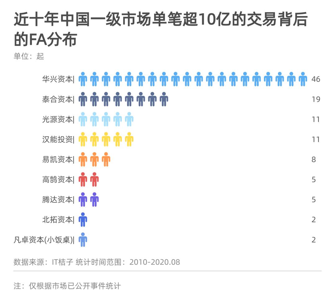 一级市场上的每一笔交易,投资方不一定都能赚到,但是参与其中的 FA 们是每一笔交易中最痛快和直接的受益者。IT 桔子根据已公开的投资事件做统计发现近十年中,华兴资本在中国 FA 市场仍占据着绝对领先地位。