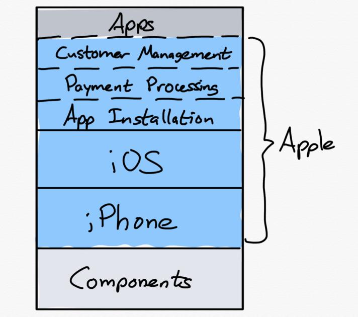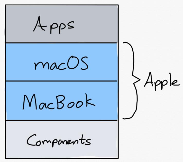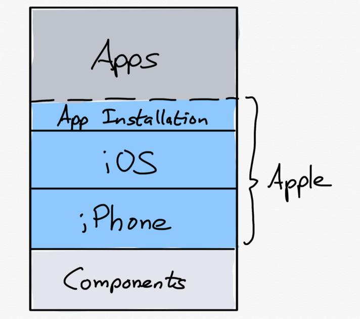 苹果公司的商业模式是利用软件来让硬件差异化,其目的是反竞争的。该公司传统上是通过销售运行苹果专有操作系统的物理设备来赚钱的;与此同时,其设备制造商的竞争对手不得不依靠他们可以授权的其他操作系统,PC上主要是Windows,移动设备上是Android。他们无法使用macOS或iOS。