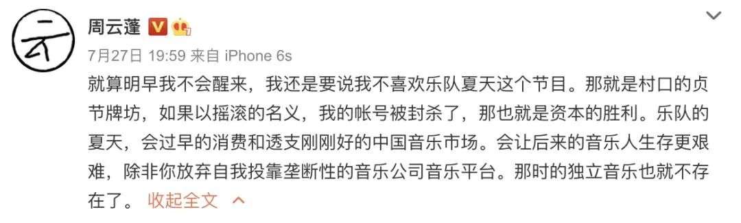 “《乐队的夏天》会过早地消费和透支刚刚好的中国音乐市场,会让后来的音乐人生存更艰难。”民谣歌手周云蓬在第一季节目播出之初,连发11条微博,质疑音乐综艺节目会让资本涌入音乐市场,消耗好不容易建立起来的中国音乐圈生态,让真正的独立音乐人的未来变得更艰难。