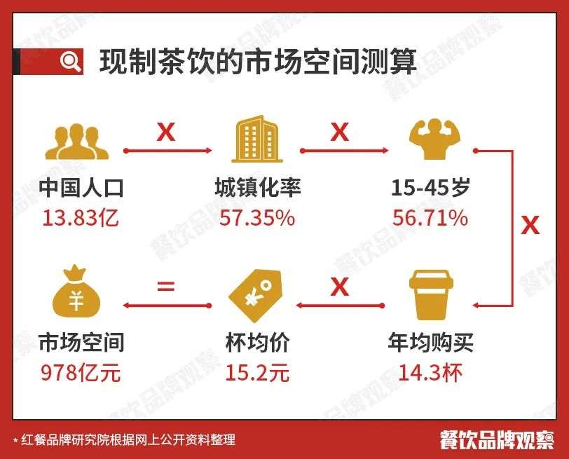 茶饮江湖跨界者云集,他们看中的无非是茶饮品类的巨大市场空间。中商产业研究院的数据表明,2019年中国现制茶饮的潜在市场规模应在400-500亿元,中国现制茶饮市场的空间在千亿元左右。