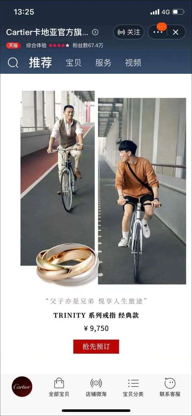 直到点进购买链接跳转到产品购买页面时,网友们彻底迷惑了。当时Cartier天猫旗舰店的首页展示刚好是广告里的这款戒指,然而“父子亦是兄弟,悦享人生旅途”的配文,让人一时摸不着头脑。