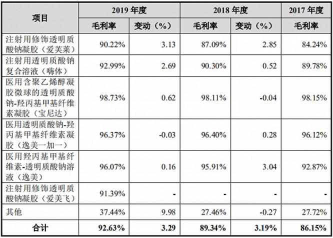 招股书显示,2017年到2019年,爱美客毛利率分别为86%、89%、92%,连年上涨。毛利率高于90%,放在任何行业这都是绝对的暴利。