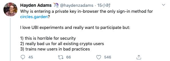 Hayden 认为,Circles 要求在浏览器内输入私钥的登录方式不够安全,除体验不佳外,还会让新用户养成坏习惯。此外,或许是由于用户参与情绪太高,今日下午有大量用户反映,Circles 的服务器已明显力不从心——「试用 10 分钟,9 分半在 loading」。Odaily 星球日报试用后确实感觉到,迟缓的网页反应速度和拥堵的网络严重影响了用户体验。