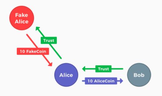 这一例子证明,Alice 想要完成交易,只能支付其他用户选择信任的货币。即使 Alice 开了 100 个假账户,并让它们彼此信任,她也永远不能花费比她拥有的 Alice Coin 更多的货币,因为 Alice Coin 是其他用户唯一信任的货币。这就是为什么用户需要谨慎对待所有的互信关系,因为一个错误的信任建立,就可能导致你所有的资金(货币)丢失。
